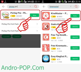 Jika sudah berhasil di instal, sekarang buka 9apps lalu cari aplikasi “PicSay Pro” dan “KineMaster Pro” dan tap GRATIS.